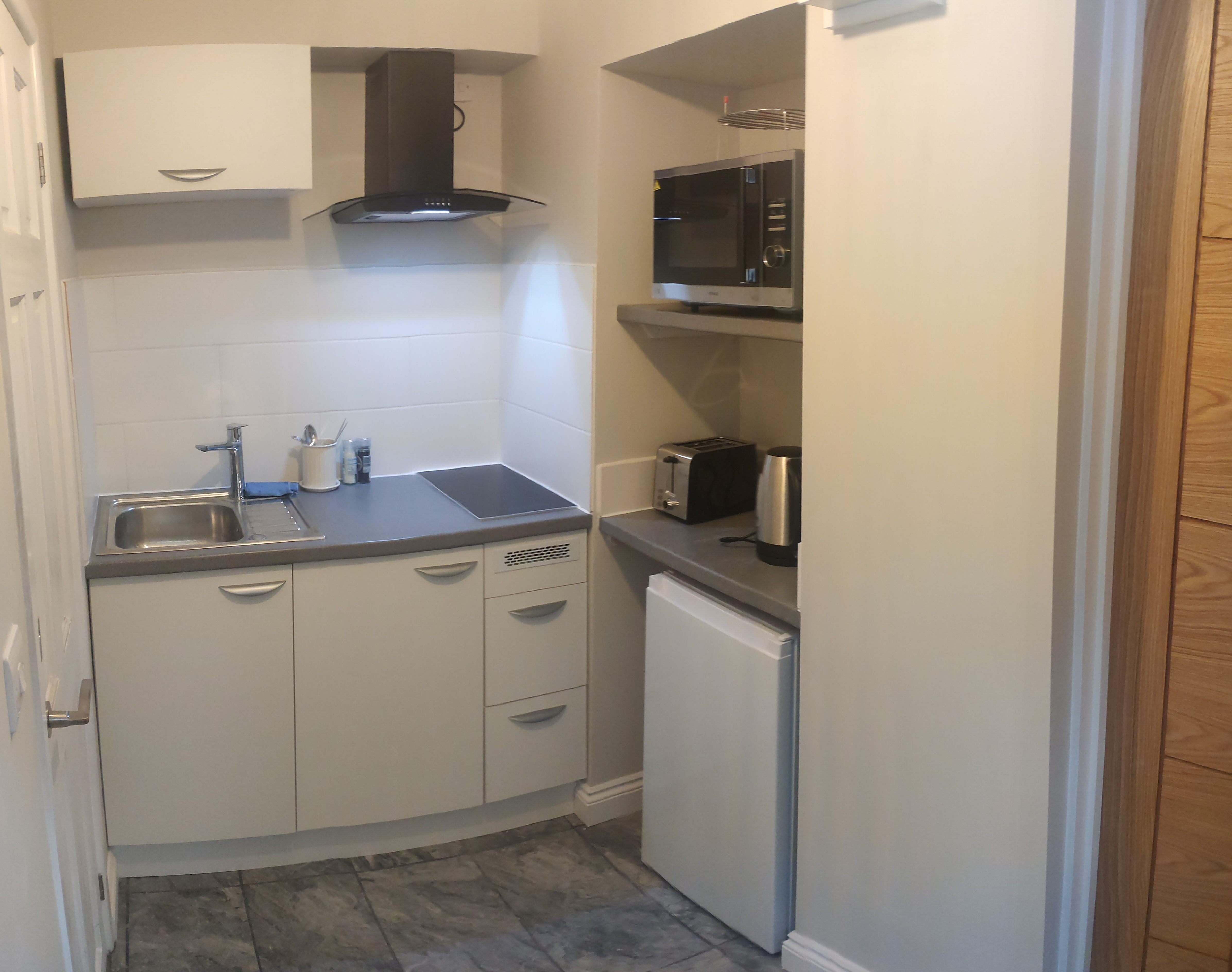 Kitchenette with Kettle, Toaster, hob, microwave and fridge with freezer box.